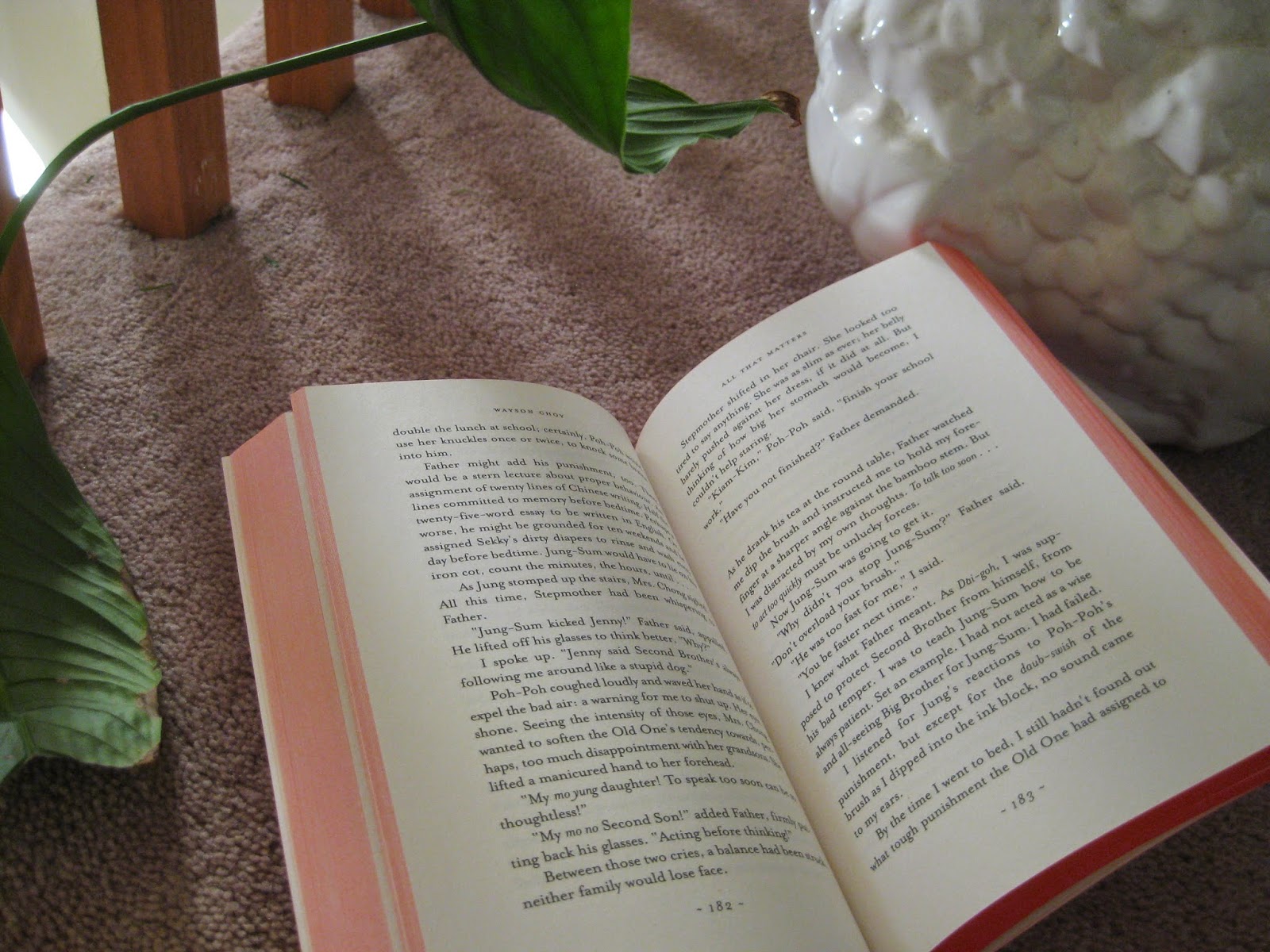 This week I read All That Matters by Wayson Choy. A lyrical piece of fiction, by way of the Asian tradition–rich in natural imagery, superstition, and family matters. Choy’s novel is a look inside the complex social dynamics of Chinese culture in light of the changing face of tradition as the Chen family adopts to life in “Gold Mountain,” more formally known as British Columbia, Canada. The Chinese understanding of filial piety is explored in a way that it is shown in the characters actions rather than told.
